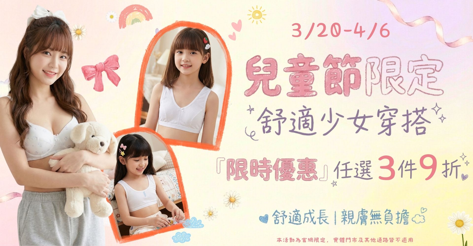 兒童節精選【兒童內衣、少女內衣、發育內衣】專區,嚴選親膚柔軟材質,無鋼圈設計,給正在成長中的女孩最舒適的包覆與支撐。無論是日常穿著的兒童內著,或是初期發育適合的少女內衣,都能在這裡找到剛剛好的選擇。現在任選3件享9折優惠,陪伴孩子自在成長每一天。