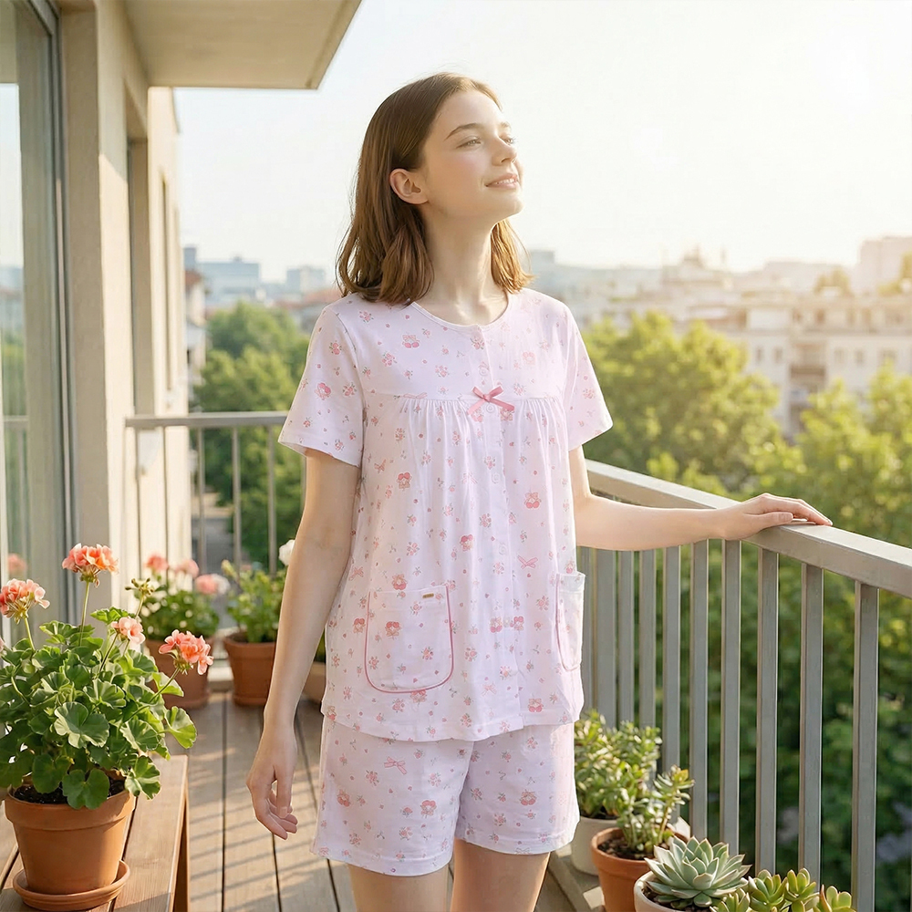 4735A6044754 櫻桃小花 柔軟舒眠棉質 睡衣睡褲成套組(粉色) 自然療癒氣息的清新柔和居家款兩件式睡衣睡褲組採用親膚棉質布料,觸感柔軟舒適可愛的櫻桃蝴蝶結小花圖樣上衣為前開鈕釦設計,方便穿脫左右附有口袋,搭配細緻滾邊點綴,展現細節巧思褲子採直筒版型,鬆緊腰頭,活動自在