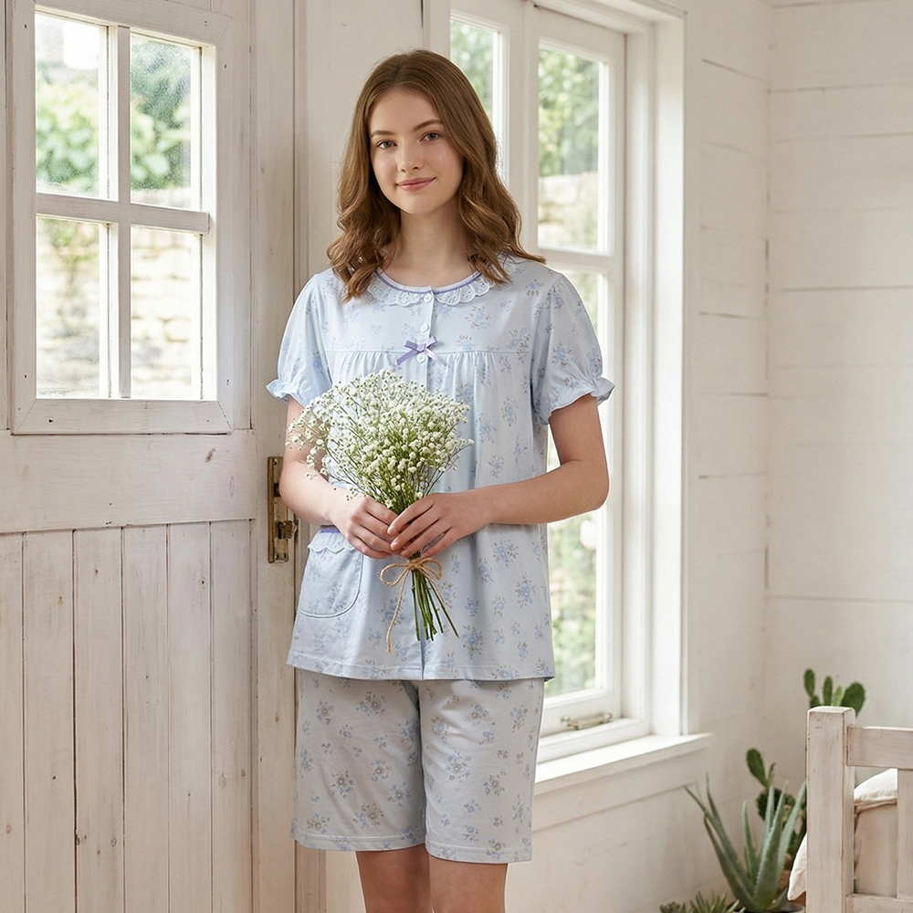 水漾小花 柔軟舒眠棉質 睡衣睡褲成套組(藍)